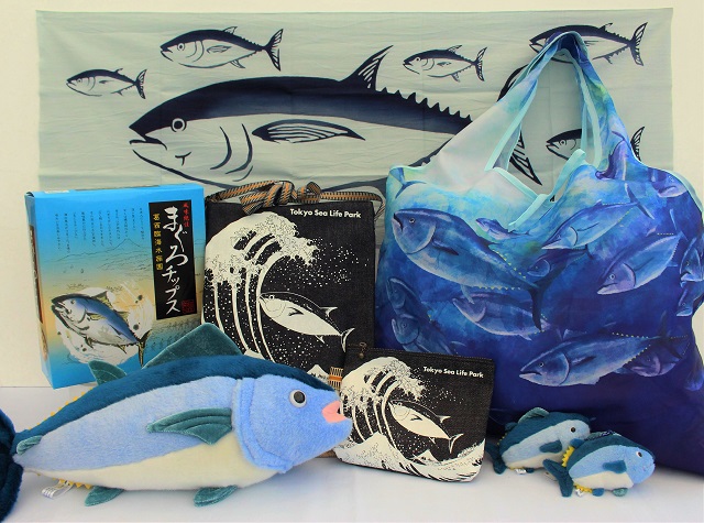 クロマグロのオリジナルグッズいろいろ。ぬいぐるみ クロマグロS1870円、デニムポーチ クロマグロ1210円、マスコット クロマグロ858円、エコバッグ クロマグロ1375円、まぐろチップス668円など