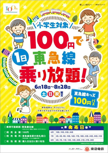 通常の東急線ワンデーパスより7割も安い東急線キッズ100円パスが土日の期間限定で登場しました。100円で東急線内乗り放題なので、普段利用しない駅で降りて散策してみるのも楽しそう。東急線キッズ100円は券売機ではなく窓口のみの販売となります。