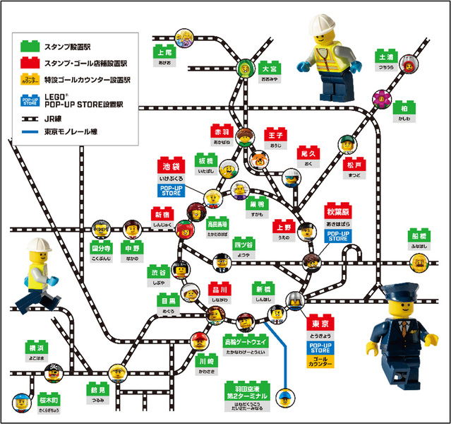 「JR東日本 レゴ(R)スタンプラリー」は、創立90周年を迎えたレゴグループがJR東日本とタイアップして実現した夏のスペシャルイベント。首都圏エリアのJR東日本29駅と東京モノレール1駅、全30駅にスタンプを設置。駅を象徴する鉄道モチーフとミニフィギュアが描かれたかわいいスタンプは、集めたくなるデザインです。