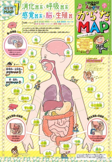 からだをめぐる旅を体感できる大判ポスター付き♪ポスター表面の「からだ MAP1」は、消化器系、呼吸器系、脳、生殖器の位置がひと目でわかるイラストで紹介。ポスター裏面の「からだ MAP2」では循環器系・呼吸器系、「からだMAP3」では骨・筋肉を紹介。からだ全体のイラストで各器官や部位の位置を分かりやすく学べます。