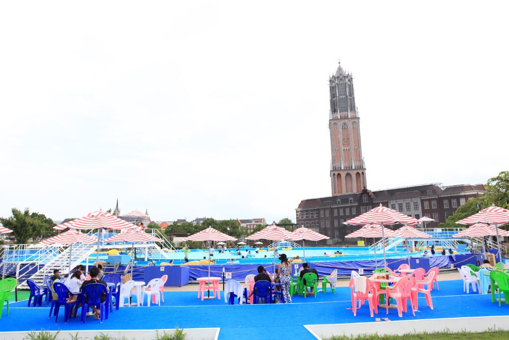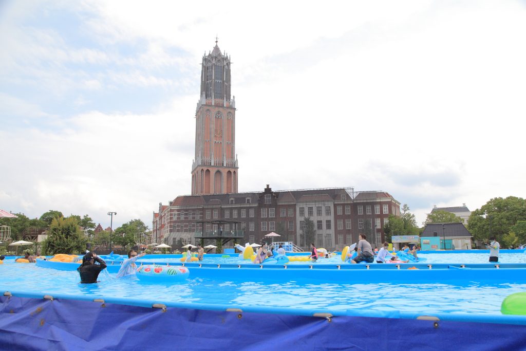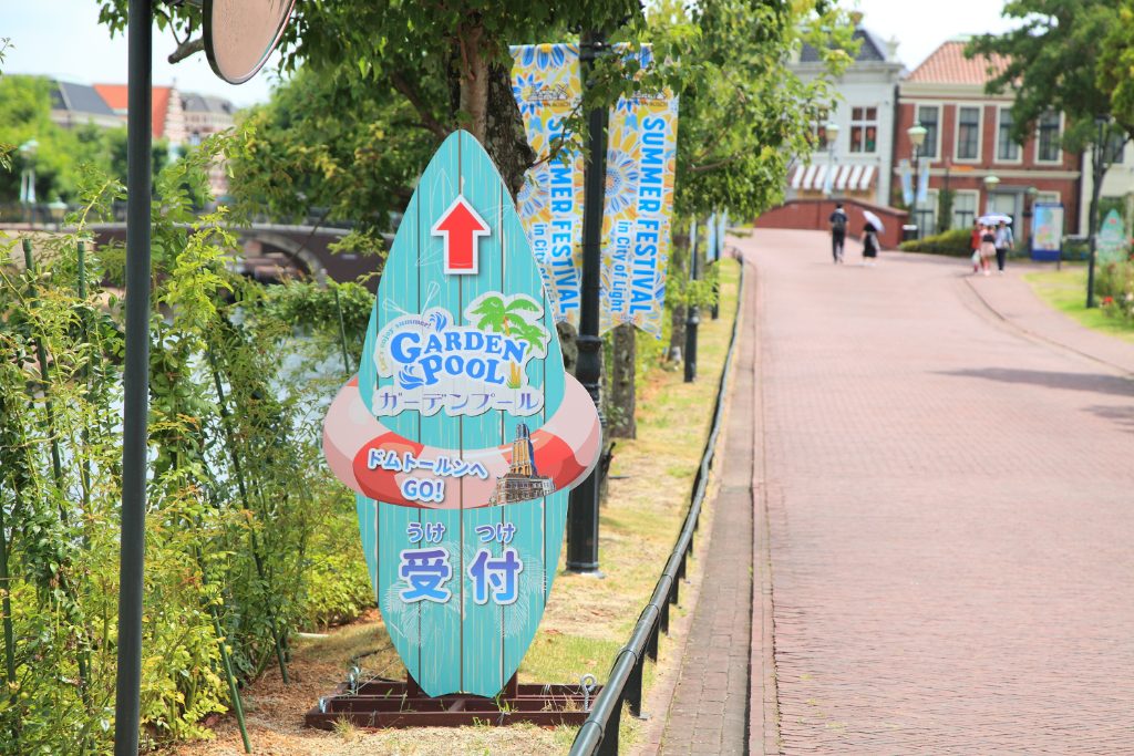 直径50mの巨大な流れるプールがある「ガーデンプール」は、シンボルタワー・ドムトールンの目の前にあり、まるでヨーロッパの街中で泳いでいるような気分に。プールには不定期でウォーターキャノンが発射され、テンションもMAX!遠くから見てもとっても涼しそうなのが分かります。