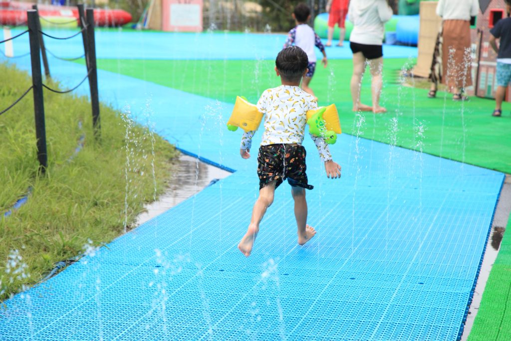 プールの周りの地面からも不定期に水が出てきます。歩いていたらちょうど水が出てきてはしゃぐ子どもや、慌てるママパパの様子が見られました。