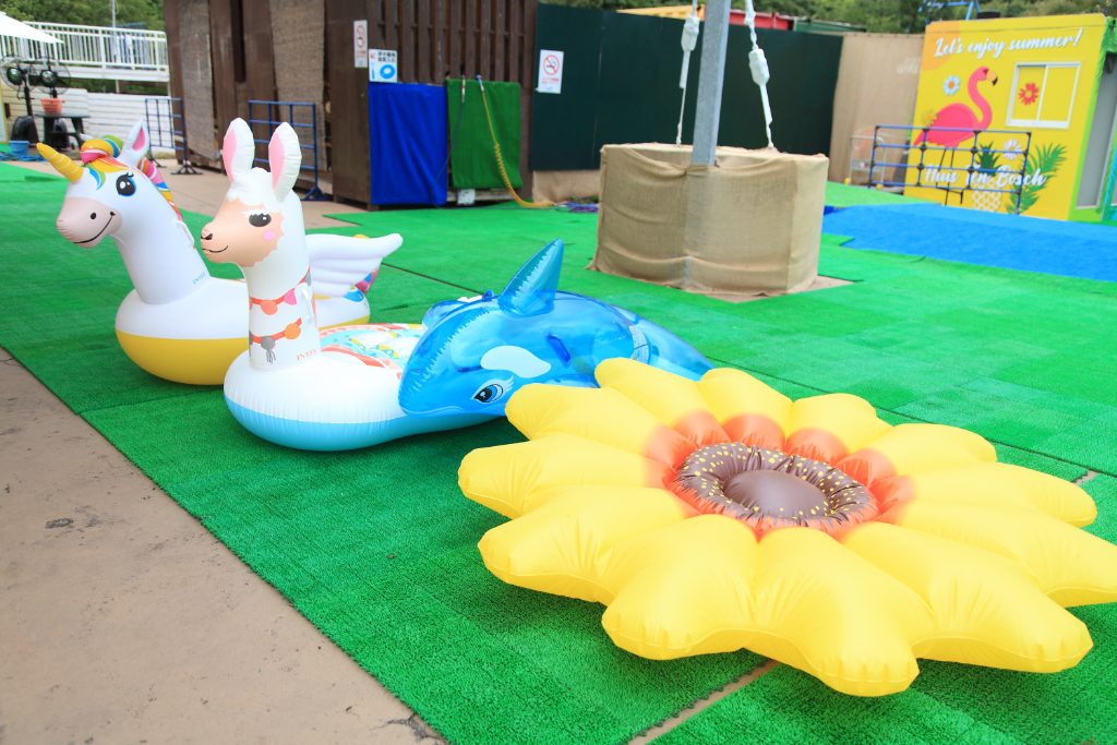 浮き輪は無料貸出しています。かわいいユニコーン型や、期間限定でヒマワリ型の浮き輪も。