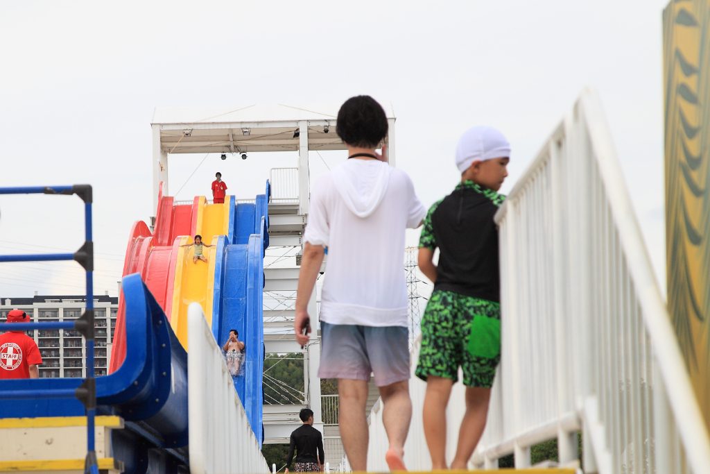高さ約10m、全長約70mのロングスライダー。滑り降りるとゴールで水がスプラッシュ!ちょっと怖そうですが、小学生の子どもも楽しく遊んでいました。