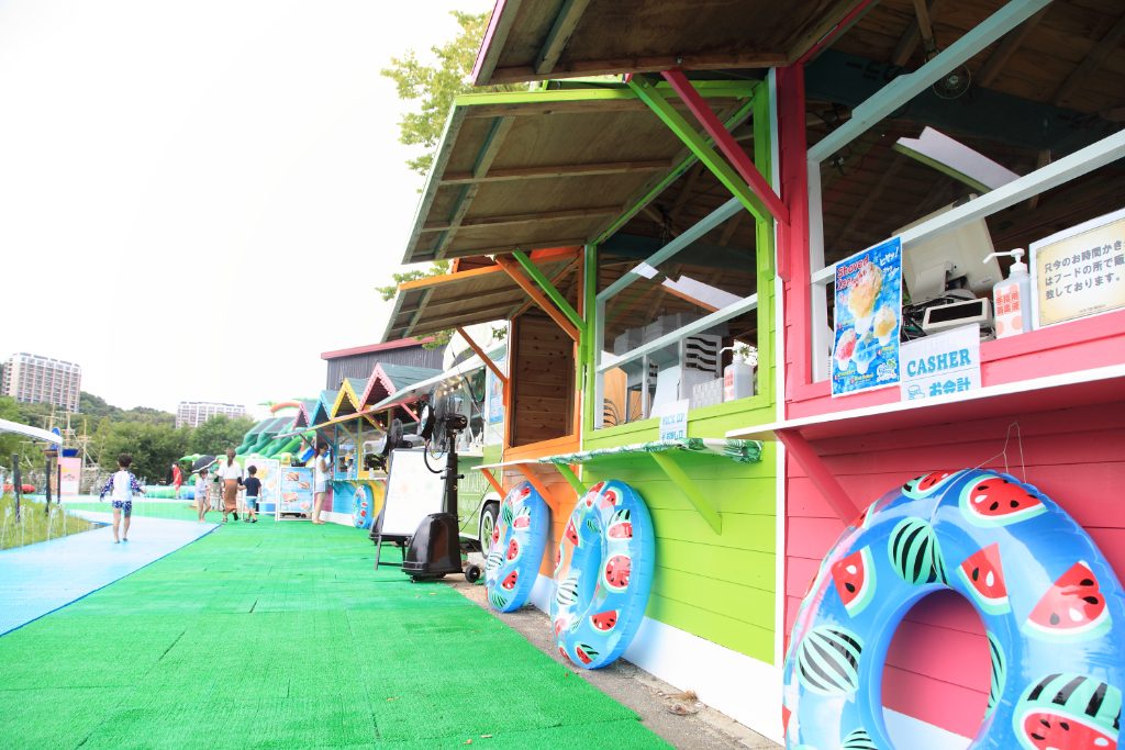 プールサイドに並ぶ屋台はカラフルで海外のような雰囲気。