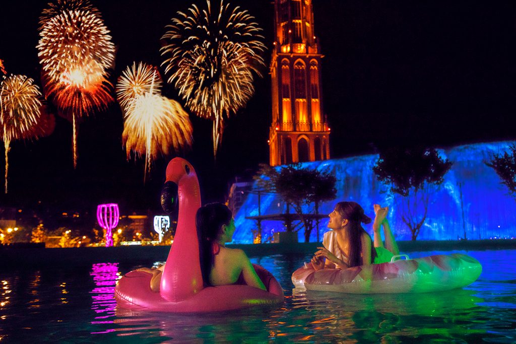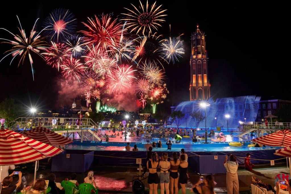 8月の特定日には花火も見られます。ナイトプールは大人向けのものが多いので、ファミリー向けのガーデンプールは子どもにとって貴重な思い出になりますね。