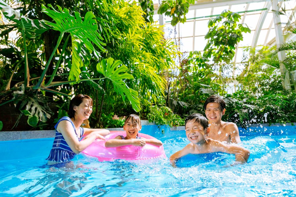 フォレストヴィラのウェルネスセンターでは、天候を気にせずに楽しめる室内型プール「森のプール」を開催中。南国の植物が生い茂りリゾート感満載! 子どもも一緒に楽しめる流れるプールやドーナツプールに加え、ゆっくりできるあたたかいジャグジー2種類(森のジャグジー・洞窟のジャグジー)もおすすめ。