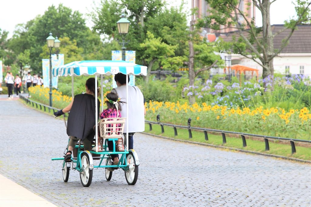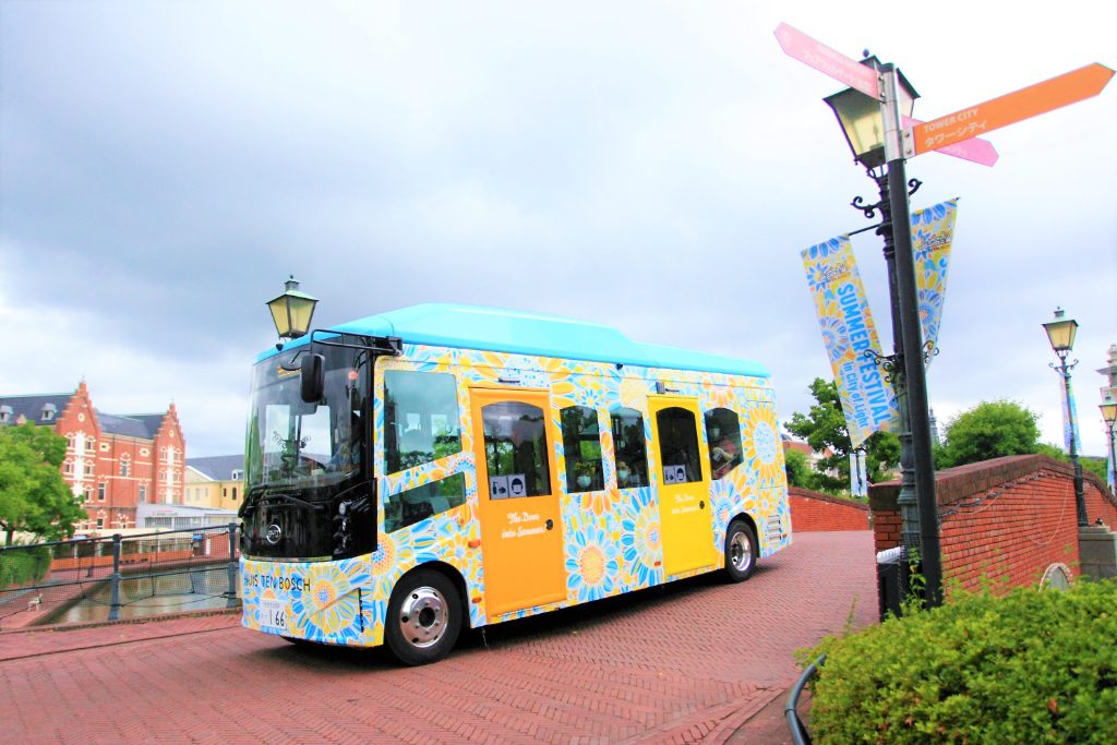 広い園内を移動するにはバスが必須。そんな頼りになるバスも、可愛いヒマワリ柄に。見かけたら思わず写真を撮ってしまいたくなります。