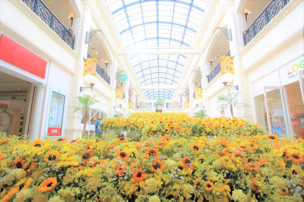 ショッピングストリート「パサージュ」も、夏仕様に模様替え。屋内施設なので天気が悪くても楽しめますし、とても涼しいので撮影していても暑くなる心配はありません。また、管理されているお花なので常に満開なのが嬉しい! 近くにミッフィーのお店や休憩できるベンチがあり、子ども連れにおすすめです。