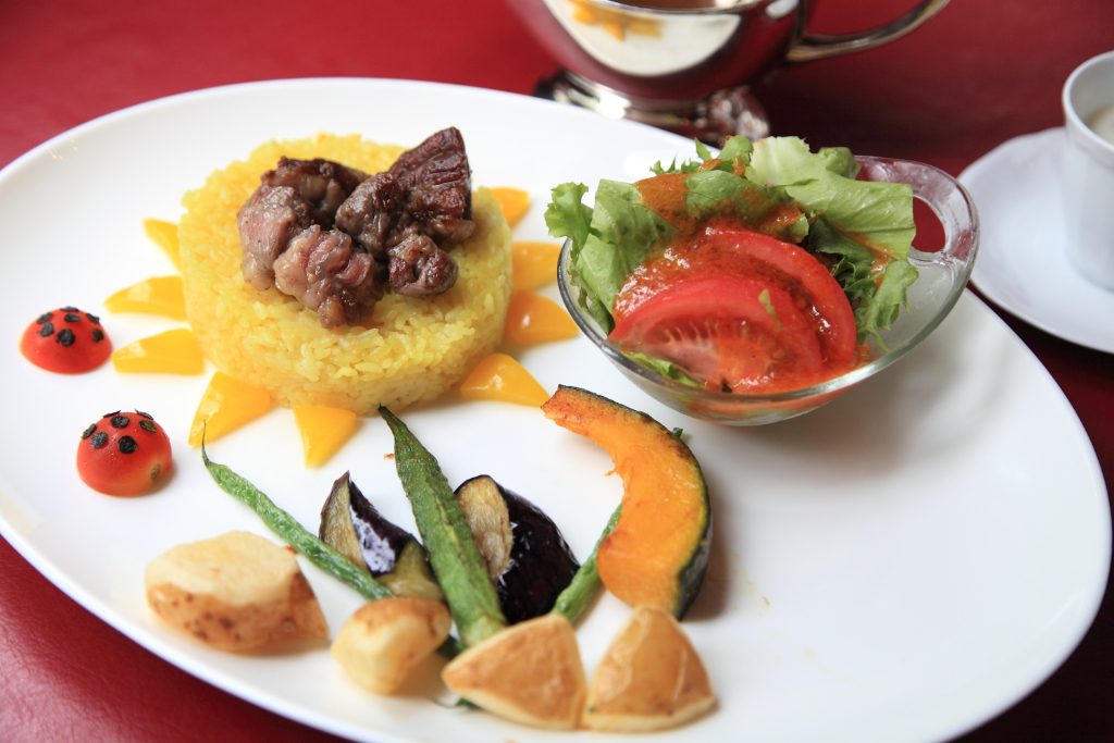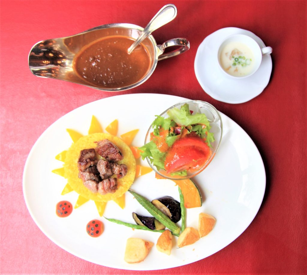 満開のヒマワリをイメージしたオリジナルスパイシーカレー。お肉がごろごろ乗っていてとっても贅沢! 冷製スープもカレーと相性抜群です。ターメリックライスを使用しており、子どもでも美味しく食べられる味付け。ルーの辛さが心配な場合は、スパイスを抑えたル―への変更も可能。