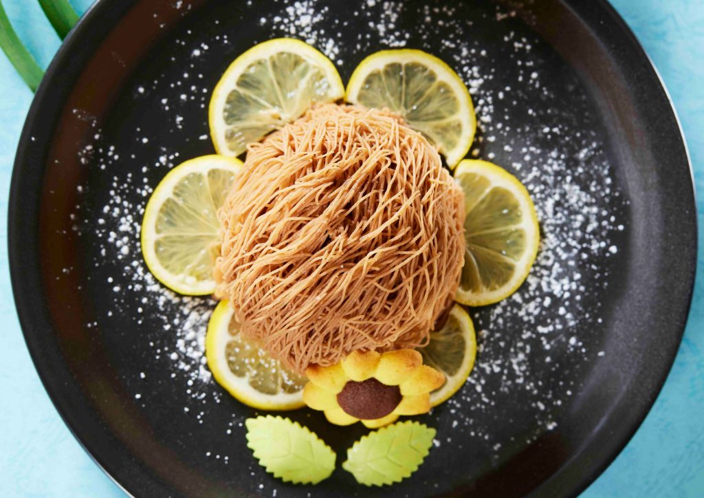モンブランの周りに添えられたレモンがヒマワリを表現。レモンとモンブランの中のレモンシャーベットの酸っぱさは、和栗ペーストと相性◎。店内限定で涼し気なドライアイスの演出もあり、子ども達も大喜びです。食べ歩き用のテイクアウトメニューもあります。