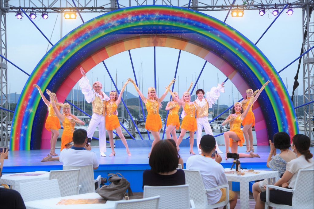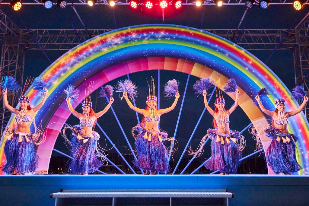 夕方から夜まで続くベイサイドステージのショーは、実力派バンドから大勢のダンサーによるラテンのダンス、迫力のポリネシアンダンスなどその内容は多岐にわたります。どれもファミリーで楽しめる内容となっていて、取材時はラテンのダンスに合わせて子ども達が飛び跳ねる様子も見られました。ステージからキッチンのテラスにかけて段差があるので、後ろの席でも良く見えます。