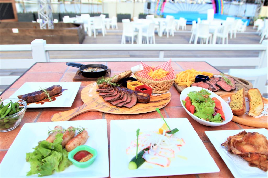 メニューもビールに合うグリルやおつまみが豊富!写真真ん中の「スペシャルグリルプレート」6,500円(税込)はチキン・スペアリブ・ビーフの盛り合わせでお肉好きにはたまらない豪華なプレートです。