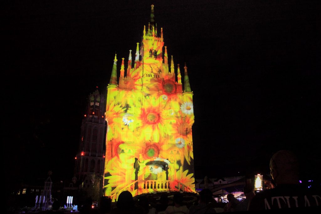更にあたりが暗くなってくると、園内の複数の箇所でイルミネーションが始まります。上の写真はギヤマンミュージアム建屋で行われる3Dプロジェクションマッピング「Splash Summer」。約6分のショーで、目まぐるしく変化する様子を楽しんでいると時間があっという間に過ぎていきます。観覧用の椅子がたくさん用意されているので、家族全員で座ってゆっくり見ることができます。