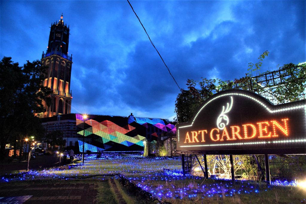 アートガーデンで行われている「光の滝『シーズナルシアター~Summer Ver~』」は建物の壁一面を使った大規模なイルミネーション。音楽に合わせてカラフルな模様が流れてくる様子を楽しめます。近くにはベンチや、ガーデン内に大きいブランコなどもあるので、座って見たい場合は早めに訪れると良いでしょう。