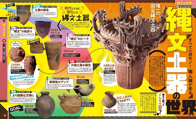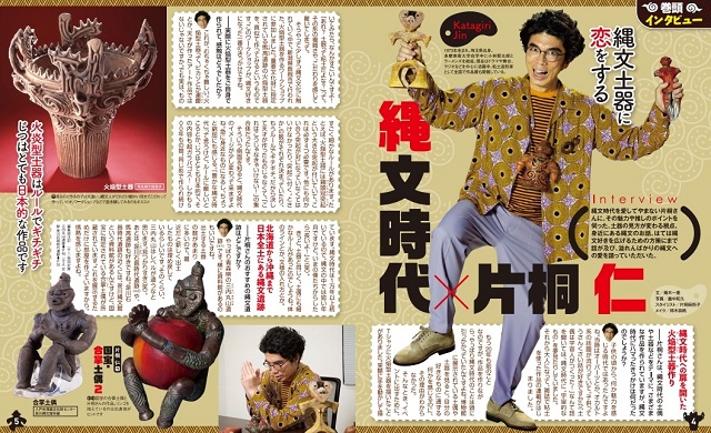 巻頭特集では、イラストや写真を使った『るるぶ』ならではのビジュアル展開で、縄文時代をわかりやすく解説。集落の様子や、土器・土偶の解説、北海道や北東北で注目されている縄文グルメやグッズの紹介もあり、見て、読んで、楽しい内容です。巻頭スペシャルインタビューでは、縄文土器に恋をした俳優の片桐仁さんが「縄文」を熱く語ります。