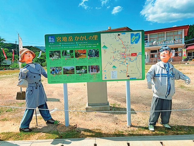 「かかし祭り」で有名な宮地岳町に立つ道の駅。校舎や校庭にもかかしが展示され、暖かく出迎えてくれる。