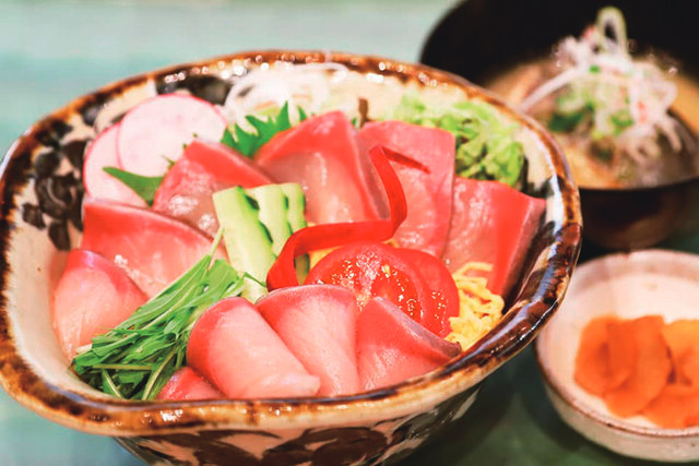 串間でとれた新鮮なブリと旬の野菜を使った、大人気のご当地グルメ「串間活〆ぶりプリ丼ぶり」(1100円)。