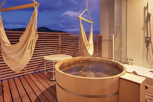 全室に木製の露天風呂&シャワーを完備。本に飽きたら、バルコニーで湯船に浸かる幸せ。