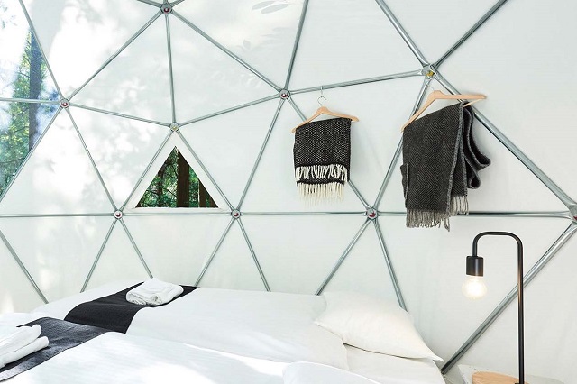 ドームテントにはシングルベッドを2台完備。天窓から森が眺められます。