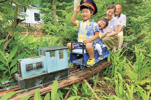 宿泊客が利用できるミニ鉄道「淵庵村森林鉄道」。小さな車両にまたがって、淵庵村をぐるり一周しよう!