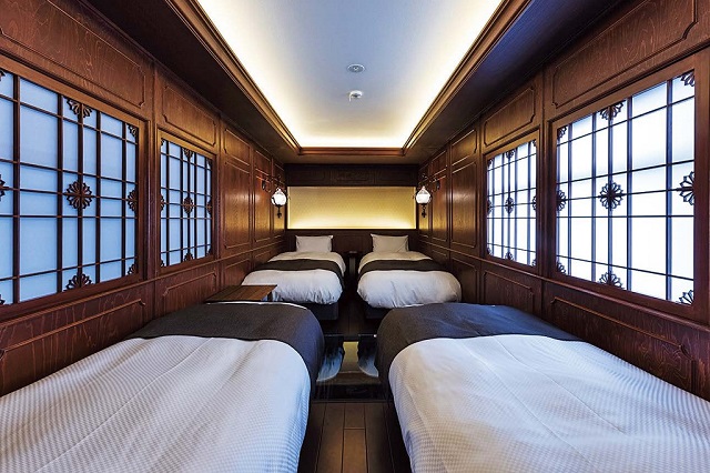 旧守実温泉駅(山国町)に停車する寝台列車をイメージした「耶馬渓の社」は、重厚な質感の内装。