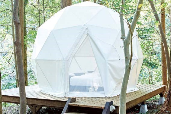 沼津の高台に造られた、60万㎢もの広大な森で過ごせるグランピング施設。かつて地元の子どもたちが林間学校として使ってきた「少年自然の家」をリノベーションしています。宿泊スタイルは3タイプ。森の中に浮かぶ球体型の「吊テント」は、360 度の自然に囲まれた不思議な空間。浮遊感を楽しみながら特別な時間を過ごせます。そのほか天窓から森が見渡せるドームテントや一棟貸しの宿泊棟があり、目的やスタイルによって選べるのがうれしいかぎり。宿泊棟は愛犬と一緒にステイできるプランも。学校の面影を残すサロンカフェや広い公園もあり、飽きることなく過ごせるはずです。