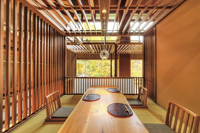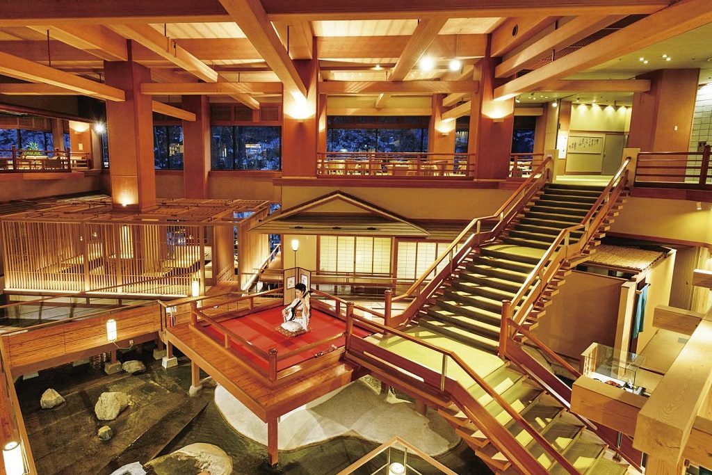山と渓流が描き出す自然美に心癒やされる老舗旅館。絶景露天風呂が人気をはじめ、加えて昨今話題となっているのが、地階から1階の吹き抜け中央にしつらえられた浮き舞台。ここでは女性が三味線を弾くパフォーマンスが楽しめるのですが、この浮き舞台の光景が人気アニメに登場するシーンにそっくりとSNSで話題になり、ファンを中心に訪れる観光客が増えているそう。アニメ作品の映像を思わせる吹き抜けや浮き舞台の迫力ある光景を楽しみながら、その世界観に浸ってみませんか。
