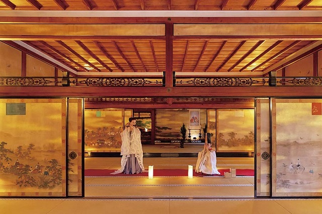 雅楽や能鑑賞など希望に応じて手配が可能。宸殿ではフロアランプの明かりの中、優美な時間が流れ、幻想的な文化体験ができます。