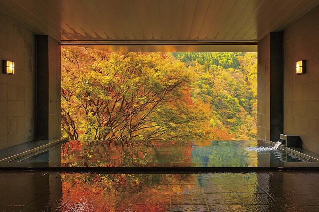 2021年3月にリニューアルした大浴場「雲遊天空の湯」。秋には渓谷の紅葉が広がります。