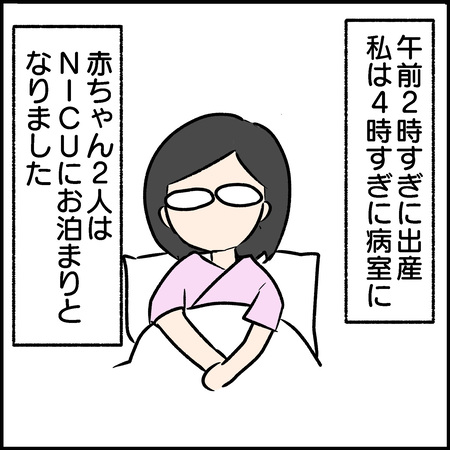 日付変わって妊娠37週0日、午前2時すぎに2人を出産しました。すぐに双子はNICU(新生児集中治療室)へ。私は傷を縫合してもらったり、なんやかんやで午前4時頃に病室に戻りました。