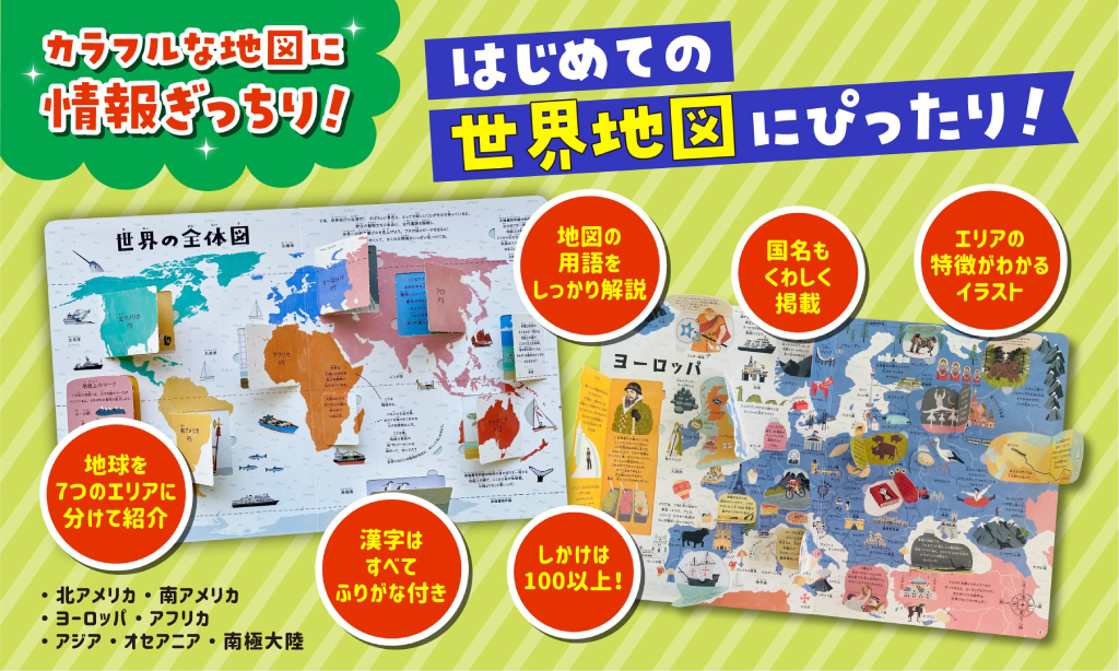 世界の国名もしっかり載っているので、はじめて世界地図にふれるのにおすすめです。小さな子どもでも読めるよう、漢字にはすべて読み仮名がふられています。