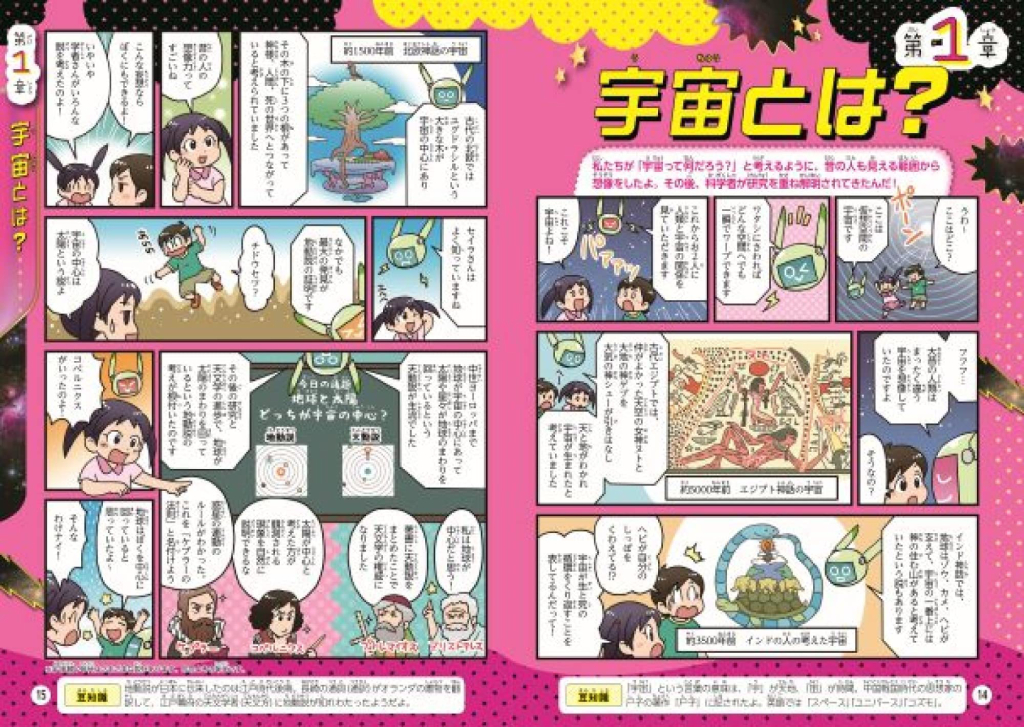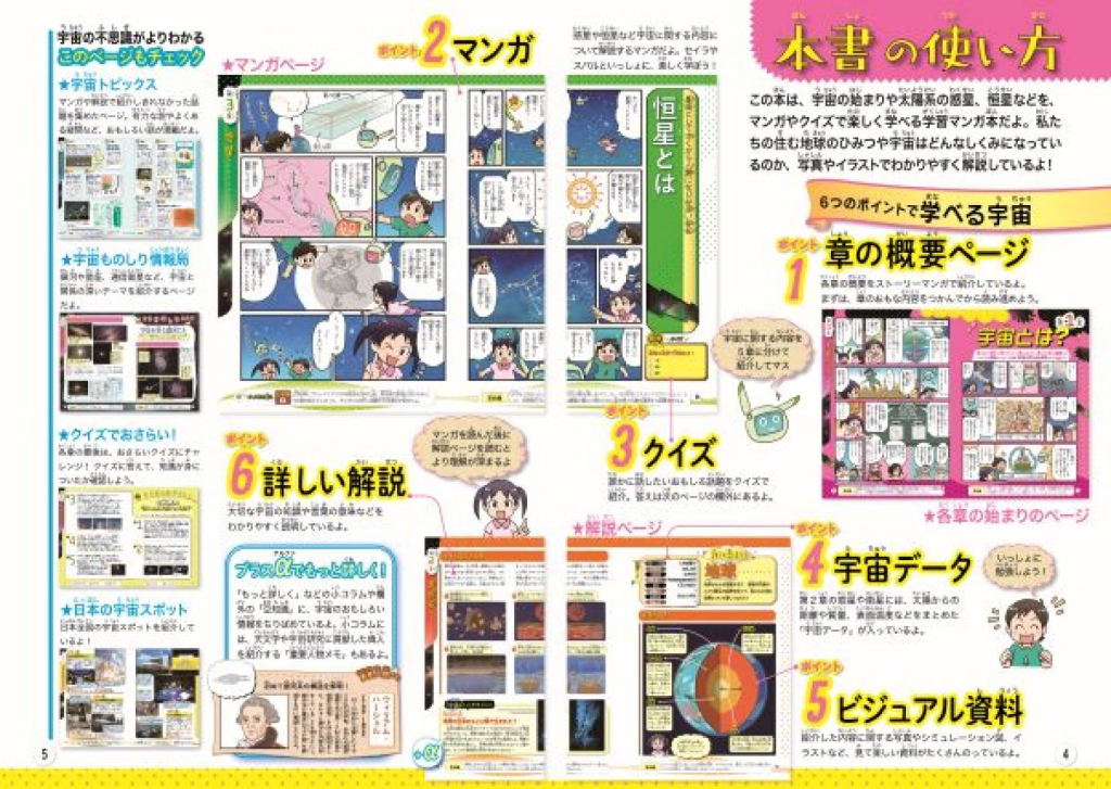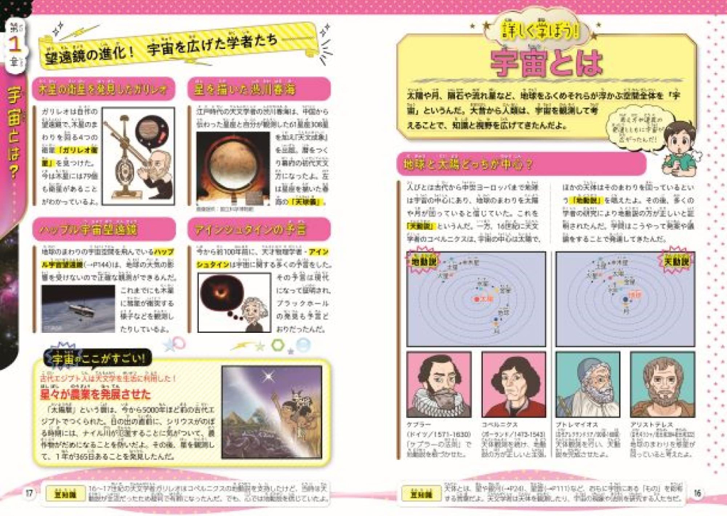宇宙に関する内容を、ストーリーマンガと解説ページで紹介しています。わかりやすい写真やイラストで、眺めているだけでも楽しいので、スッと頭に入ってきますね。