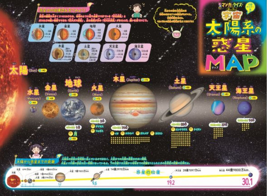表は「太陽系の惑星MAP」太陽に加えて水星、金星、地球、火星、木星、土星、天王星、海王星の8つの惑星がひと目でわかります。