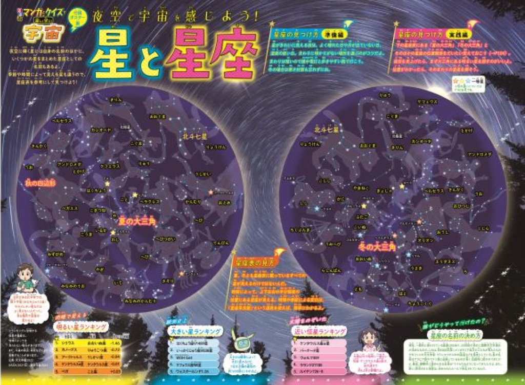 裏は「星と星座」夏と冬の星座を大きく紹介。星の位置だけでなく、星座のイラストがセットでわかりやすい!