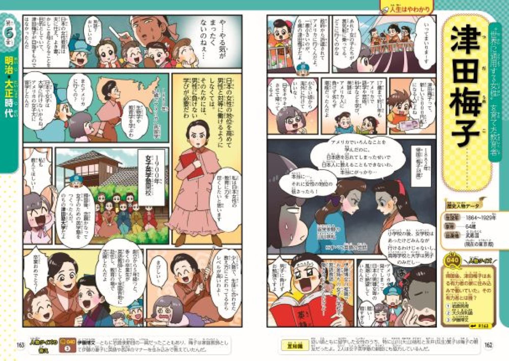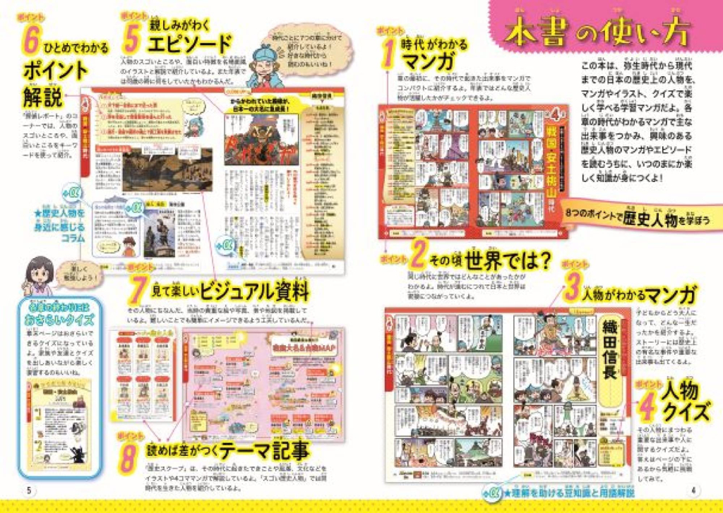 時代ごとのマンガで日本史の流れをつかみ、人物の生涯マンガとエピソードを楽しく読むうちに、人物の功績を知るだけでなく、いつのまにか日本史全体の理解が深まるよう工夫しています。また、2022年から導入された高校の歴史科目「歴史総合」の導入として、特に関わりの深い近代以降に、外国で学んだり活躍した日本人も紹介しています。彼らの人生を通して現代に通じる日本と世界の関わりを学ぶことができます。