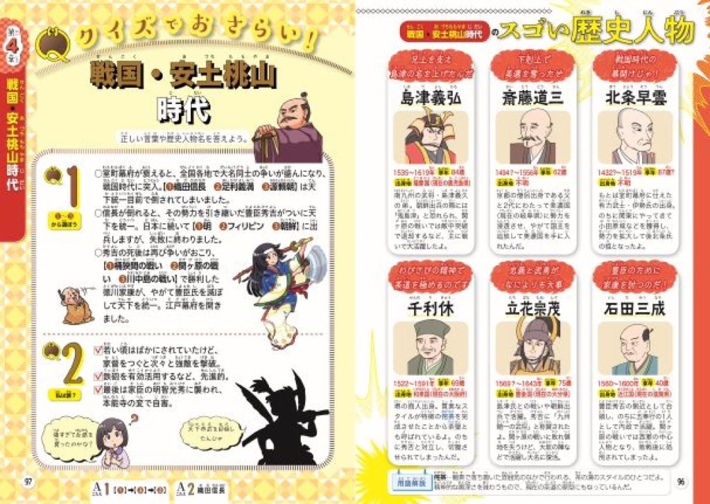 各時代ごとにクイズを出題しています。解説もついているので、理解をさらに深めることができます。家族や友達同士でクイズを出しあい、遊びながら学ぶのもおすすめ。
