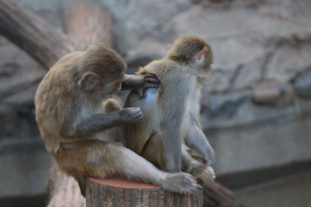 サル山では、14頭のアカゲザルが群れをなして生活しています。アカゲザルはニホンザルよりもひと回り小さく、しっぽが長いのが特徴。気持ちよさそうに毛づくろいをする姿や、元気よく跳ね回る姿は、ずっと眺めていても飽きません。