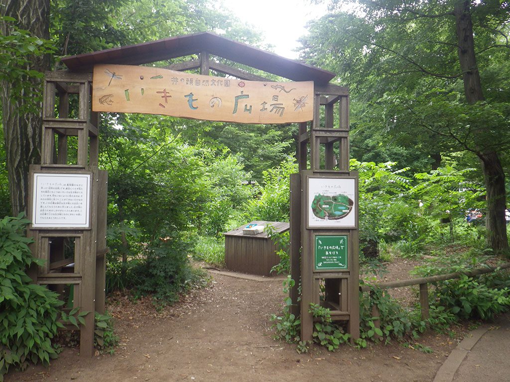 林や池などの生き物のすみかが用意された「いきもの広場」。何もいないように見えますが、実はカマキリやカブトムシなど、私たちにとって身近な生き物がたくさん暮らしているんです。雑木林や草はらの間、池の中や石の裏などを、じっくり探してみましょう。