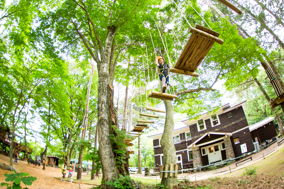 「スウィートグラス・アドベンチャー」は、群馬県北軽井沢の原生林「ルオムの森」を舞台にした、フランス発の樹上の冒険「フォレストアドベンチャー」が楽しめる施設です。施設内には3つのコースがあり、それぞれに年齢や身長制限が設けられており、事前ブリーフィング(安全講習)があるので安心。命綱となるハーネスを装着し、自分で安全を確保しながら木立の中のコースを進んでいく、まさに「冒険」が楽しめる施設です。