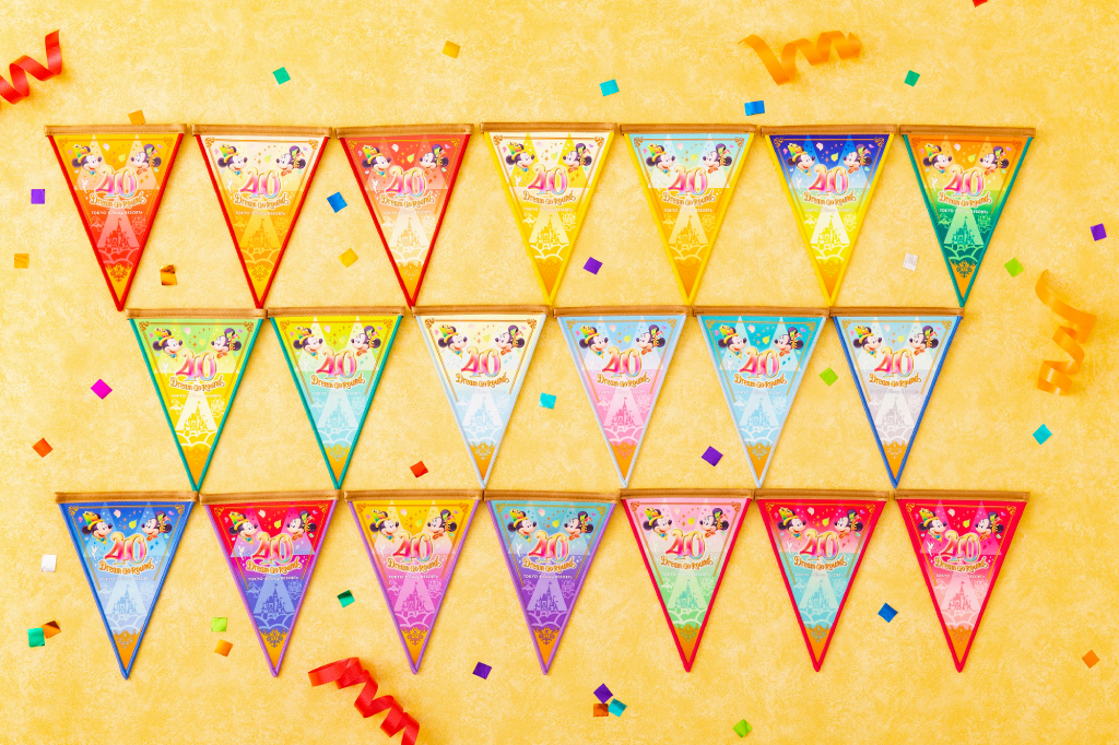 注目は、40周年を象徴するキーアイテム「ドリームガーランド」。好きなカラーを選んで、家族や友達と身に着けてパークを周ったり、コレクションとして繋げて部屋に飾ったりなど、パークでも家でも周年の祝祭感を味わえるアイテムになっています。