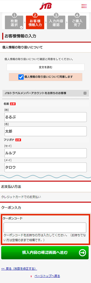 お客様情報を入力し、画面下のクーポンコード入力欄に、当選連絡のダイレクトメール(DM)に記載のクーポンコードを入力してください。クーポンコード入力後、「購入内容の確認画面へ進む」ボタンを選択してください。