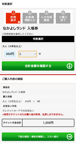 チケットの料金種別、購入枚数を選択します。