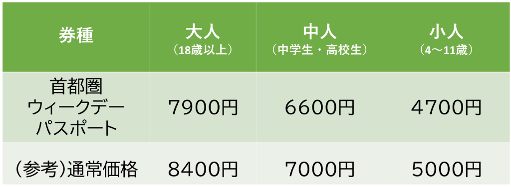 ■2023年4月6日(木)~6月30日(金)期間の「首都圏ウィークデーパスポート」チケット価格