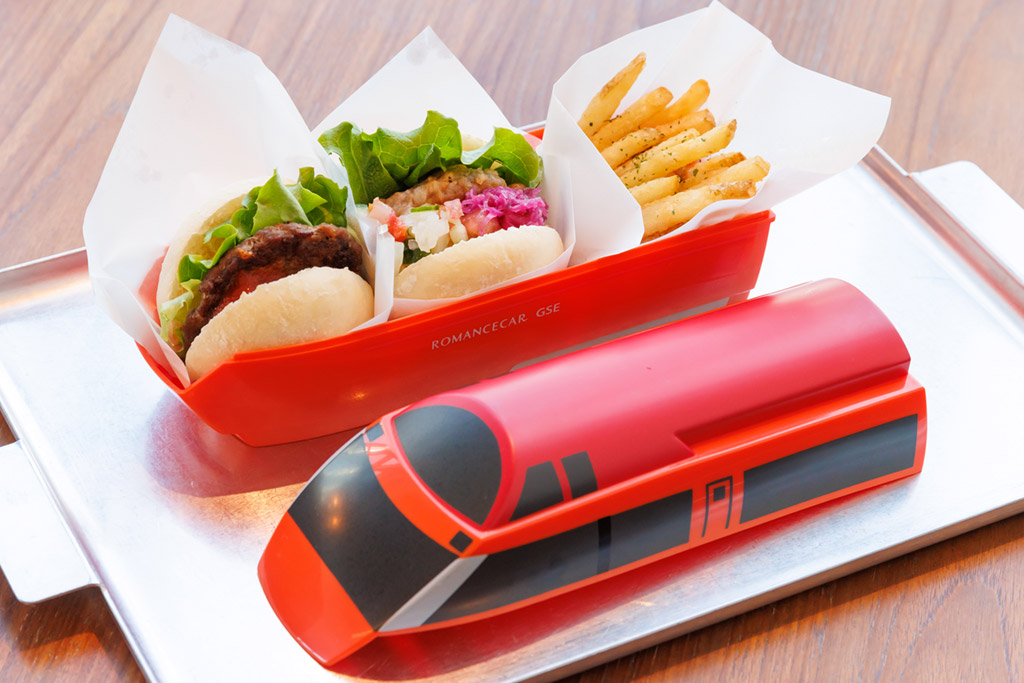 GSEのお弁当容器にミニバーガー、ミニゼロミートベジバーガー、フライドポテトを詰め込んだセット。キッズの人気ナンバーワンで、もちろん容器も持ち帰り可能。このお弁当容器は、かつてロマンスカーの車内販売で使用されていたもので、現在入手可能なのはココだけ! 親子や兄弟・姉妹でシェアするのも楽しいですね。