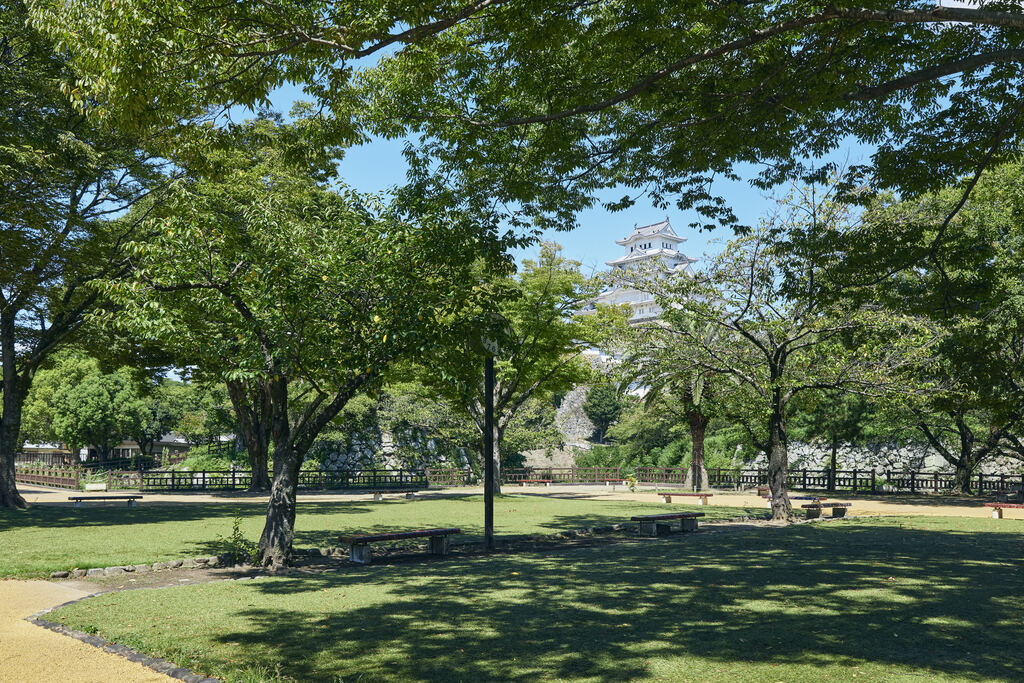 園内の中央部にある芝生広場。レジャーシートをひいてピクニックを楽しんだり、姫路城が見える景色を眺めたりとのんびり過ごせるスポットです。