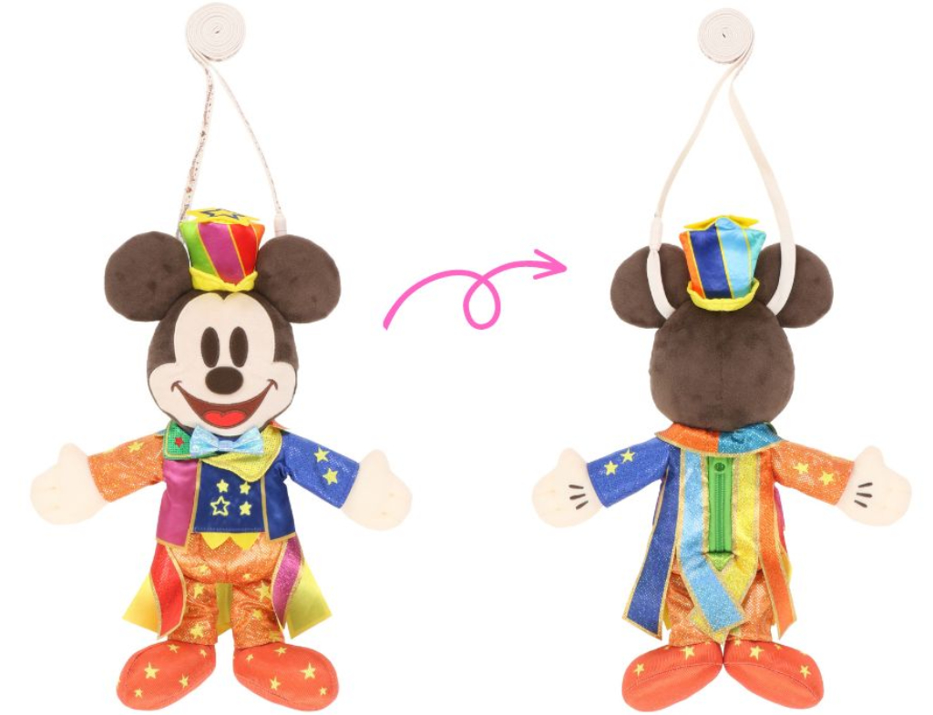 華やかな衣装を身にまとったミッキーマウスのかわいいショルダーバッグ。背中のチャックから中に小物を入れられます。どこでもミッキーと一緒ですね♪