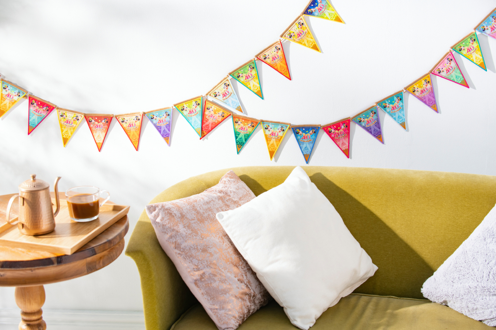 40周年のキーアイテムは「ドリームガーランド」。ガーランドとは、花や旗などを紐でつなぐ装飾品のこと。パーク内のデコレーションもガーランドでいっぱいです!また、イベントのテーマである「カラフル」や「ナナイロ」といった要素も加わって、とっても鮮やかなグッズがたくさん登場しています。