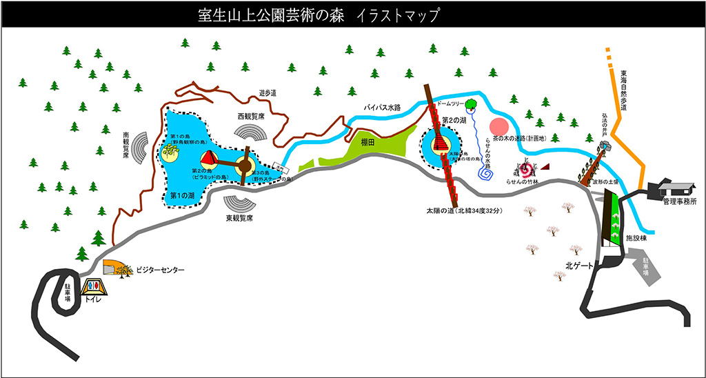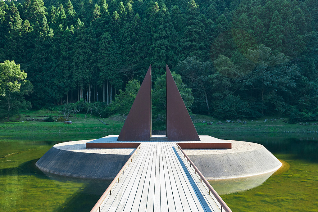 塔から真っ直ぐのびる橋は、「太陽の道」とよばれ、奈良から伊勢へとつづく北緯34度32分のライン上にあります。このライン上には古代遺跡や由緒ある神社が立ち並んでいるとか。いにしえの太陽信仰や古代史ロマンを感じさせてくれる壮大な作品となっています。