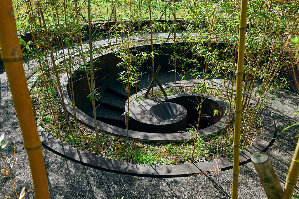 写真の「螺旋の竹林」は、脇に竹がのびる螺旋状の通路をぐるぐると回りながら下に進んでいく構造です。一番下までたどり着くと、トンネル状の通路につながり地上へ舞い戻るようになっています。地上と地下、明と暗という対比を表現した作品です。